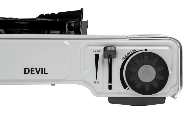 Der bewährte Devil Gaskocher verfügt über eine integrierte Piezozündung, einen Alu-Brenner und ein abgedichtes Ventil. Der Kocher bietet Schutz vor Überdruck, Vorbeugung gegen Gasausfluss und Schutz vor einer falschen Positionierung. Einstellen kann man die Gaszufuhr ganz einfach an den vorn angebrachten Regelknöpfen.