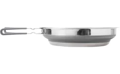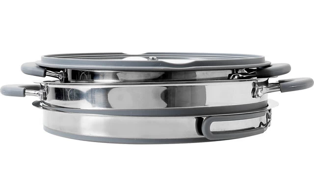 Das 4-teilige Kochset aus hochwertigem Edelstahl und Silikon besteht aus einem großen Topf, einer Pfanne mit abklappbarem Griff, einem praktischen Sieb und einem Deckel aus bruchsicheren Glas wie auch Anti-Rutsch-Kante. Die Griffe sind mit hitzebeständigem Silikon beschichtet. Und das Beste: Das Set ist dank flexibler Silikonwände extrem flach zusammenfaltbar (9 cm Höhe) sowie ineinander verstaubar – so nimmt es nur wenig Platz im Gepäck ein. Zudem ist es pflegeleicht, lebensmittelecht, BPA-frei und spülmaschinengeeignet.