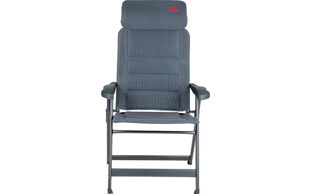 Luxuriöser verstellbarer Campingstuhl mit gepolstertem 3D-Sitz und verstellbarer Rückenlehne. Die extra hohe Lehne ist in 7 Positionen verstellbar und die Kopfstütze ist unendlich beweglich. So wird maximaler Sitzkomfort garantiert. Das gepolsterte Gewebe rahmt den Stuhl ein und sorgt für die optimale Bequemlichkeit. Der Stuhl kann sehr flach zusammengefaltet werden und eigenet sich dager gut für den Transport. Der angebrachte anodisierte H-Rahmen sorgt für zusätzliche Stabilität und Festigkeit.