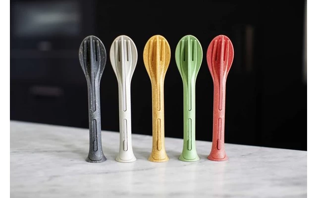 Der ideale Reisebegleiter: Messer, Gabel, Löffel werden einfach ineinandergesteckt und passen dank ihrer kompakten Größe in jede Jackentasche.