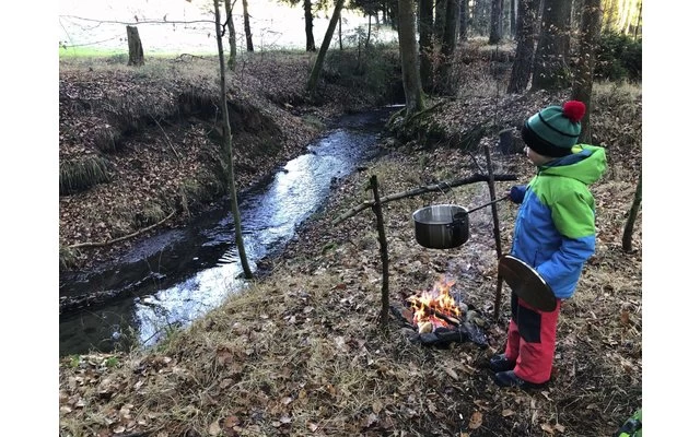 Die zwei außerhalb des Schwerpunktes angebrachten Henkel bieten beim Tragen und am Dreibein sicheren Halt. Ausgerüstet mit den mitgelieferten Standbeinen kann der Topf über einen Kocher oder ein Feuer gestellt werden.