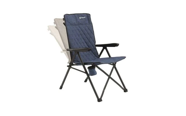 Vollpolsterung aus Polyester mit dreifach verstellbarer Rückenlehne für perfekten Komfort beim Essen oder Entspannen, getragen von einem langlebigen, hochfesten, pulverbeschichteten Stahlrahmen mit breiten Armlehnen aus Kunststoff. Zu den Ausstattungsmerkmalen zählen ein Becherhalter und ein geringes Packmaß dank der enthaltenen Tragetasche.