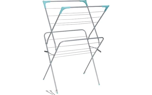 Er ist extrem platzsparend und hat ein sehr flaches Packmaß von nur 5 cm. Die seitlichen Sicherungsbügel ermöglichen einen sicheren Stand, zusätzlich kann der Wäschetrockner mittels der Zeltnägel (im Lieferumfang enthalten) befestigt werden. Länge der Wäschelänge gesamt ca. 9,3 m.